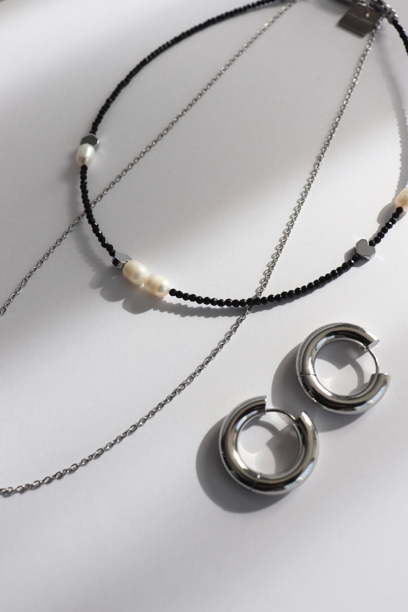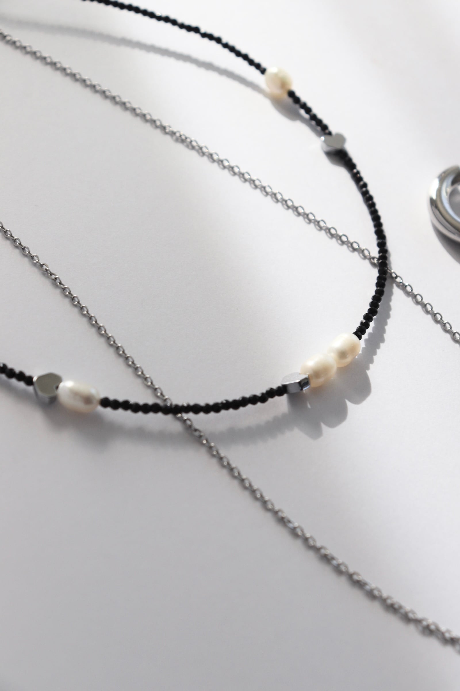 強い輝きを放つブラックスピネルと、柔らかな淡水パールのコントラストが美しいチョーカー。