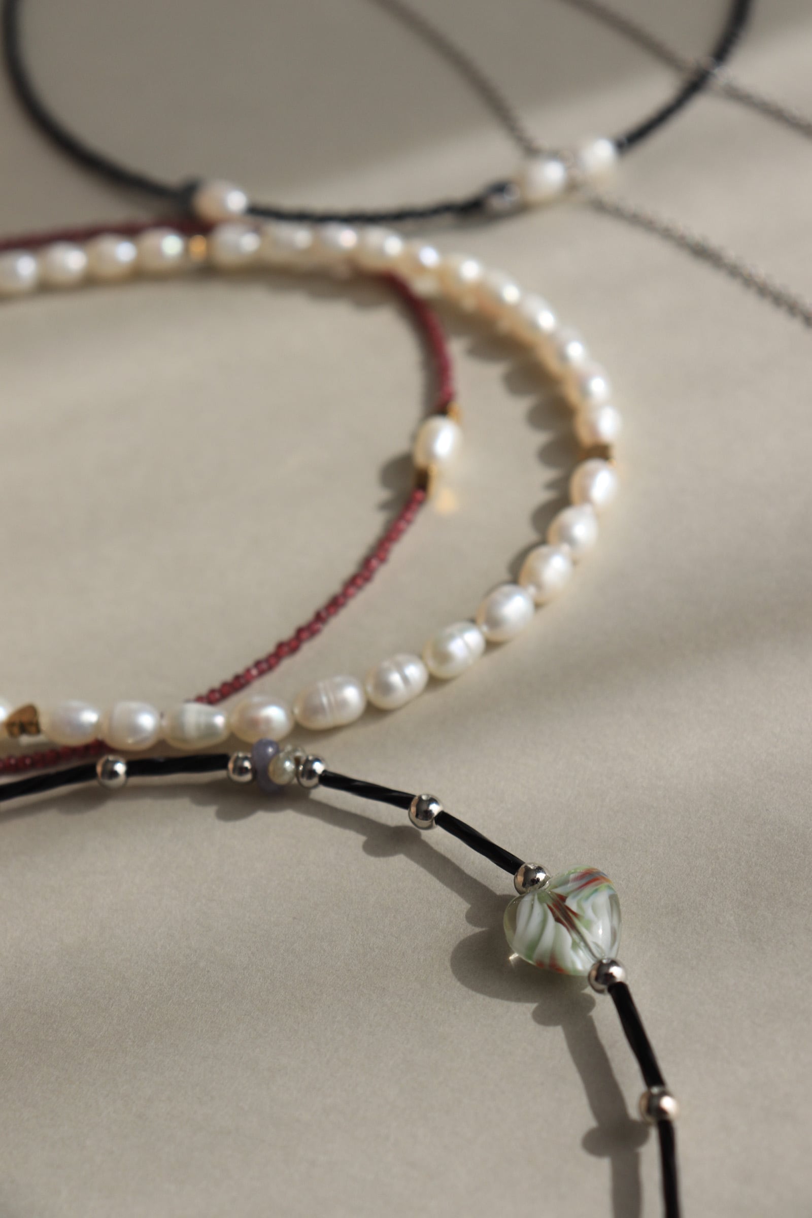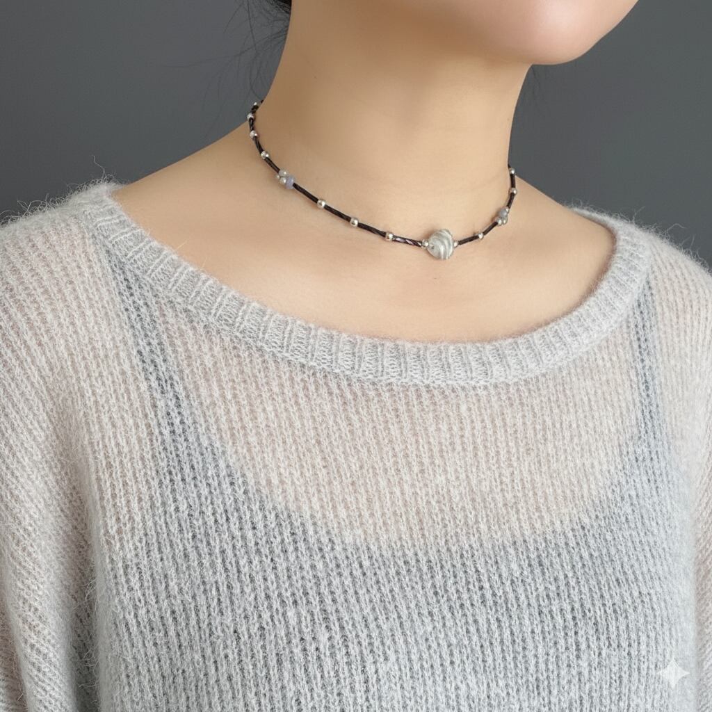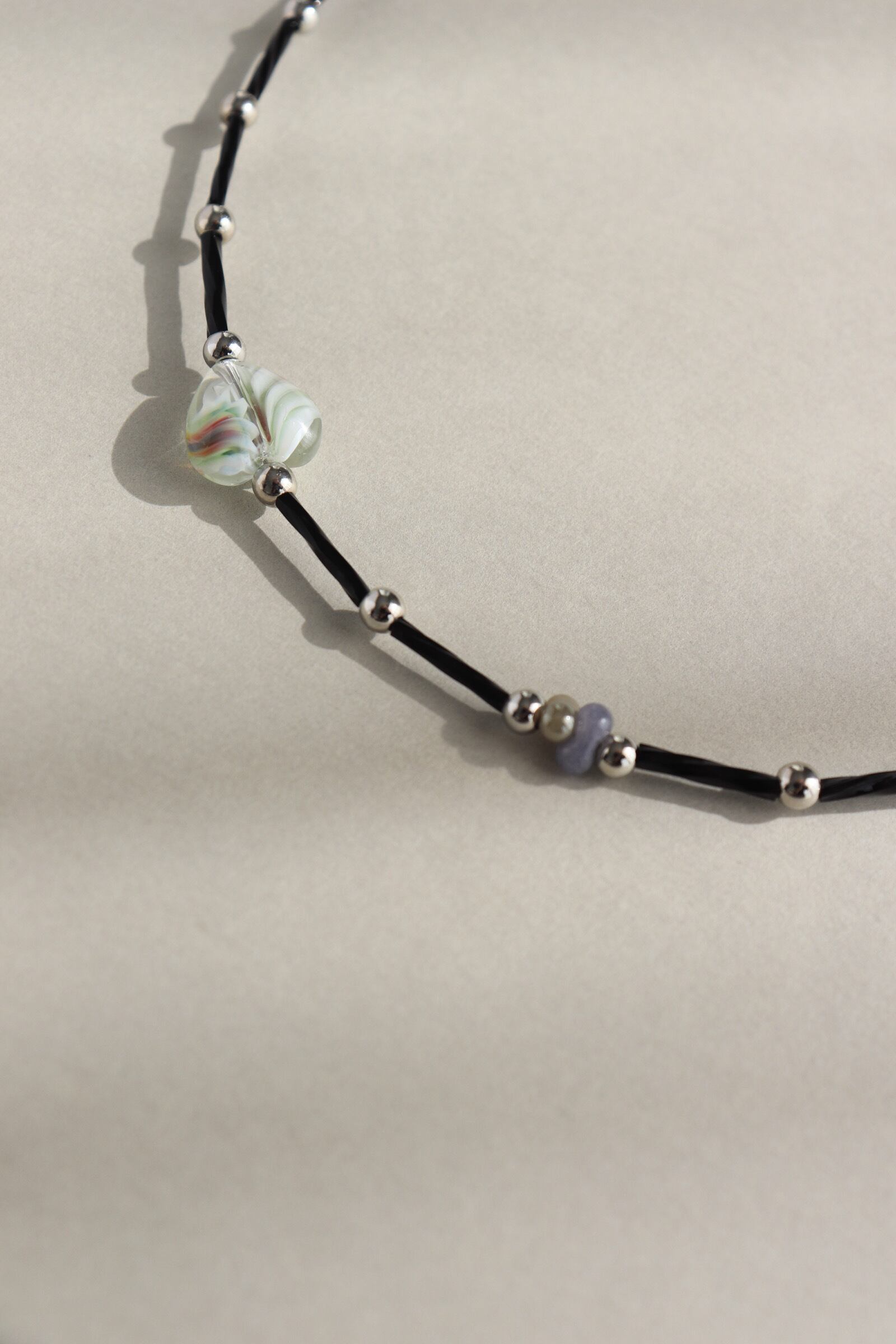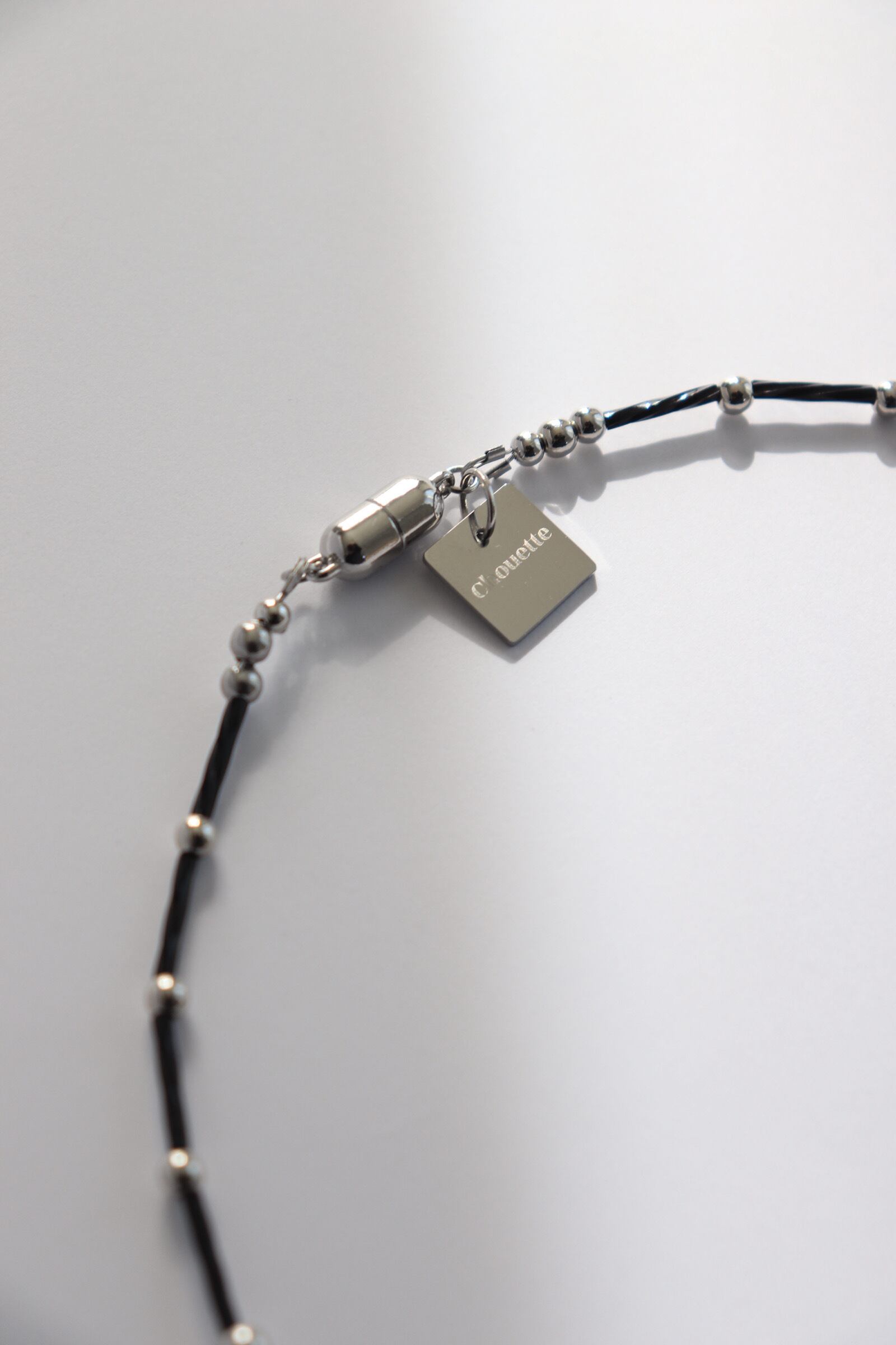 シックなブラックのガラスパーツに、洗練された輝きのシルバービーズを組み合わせたモードなチョーカー。