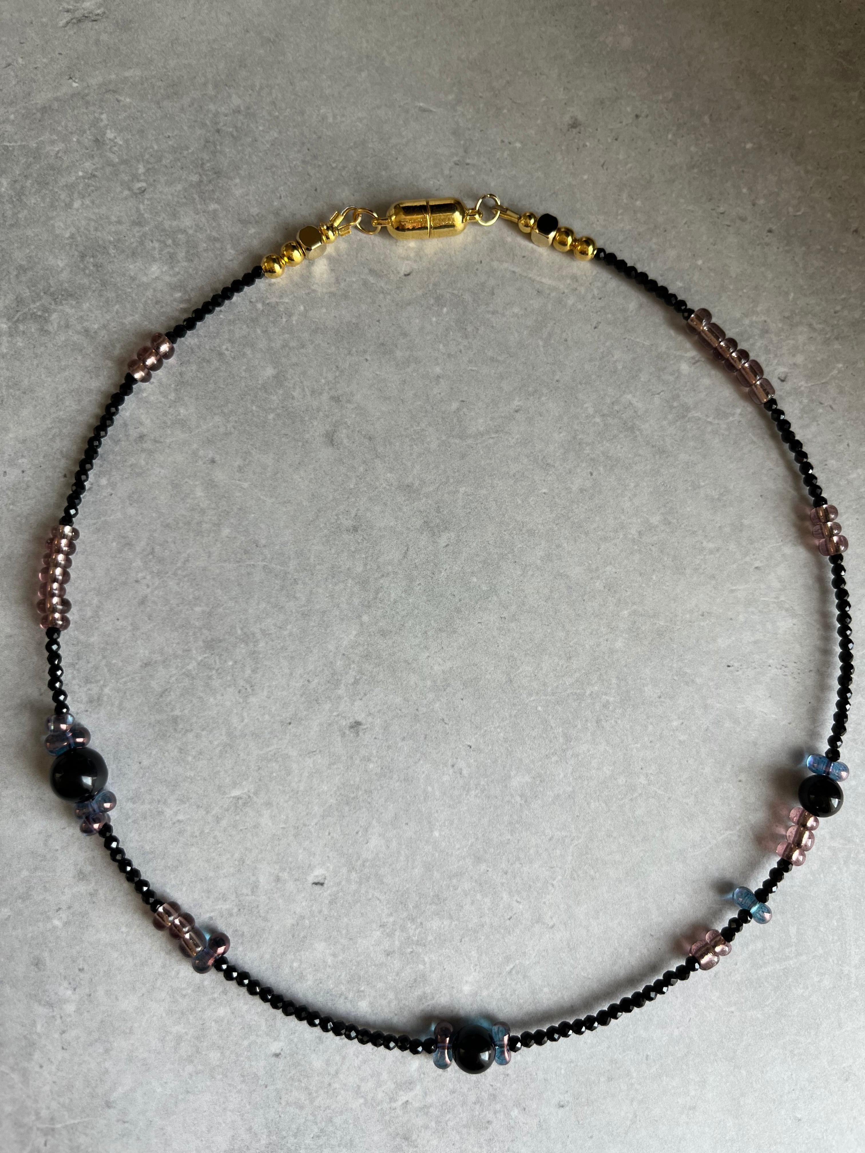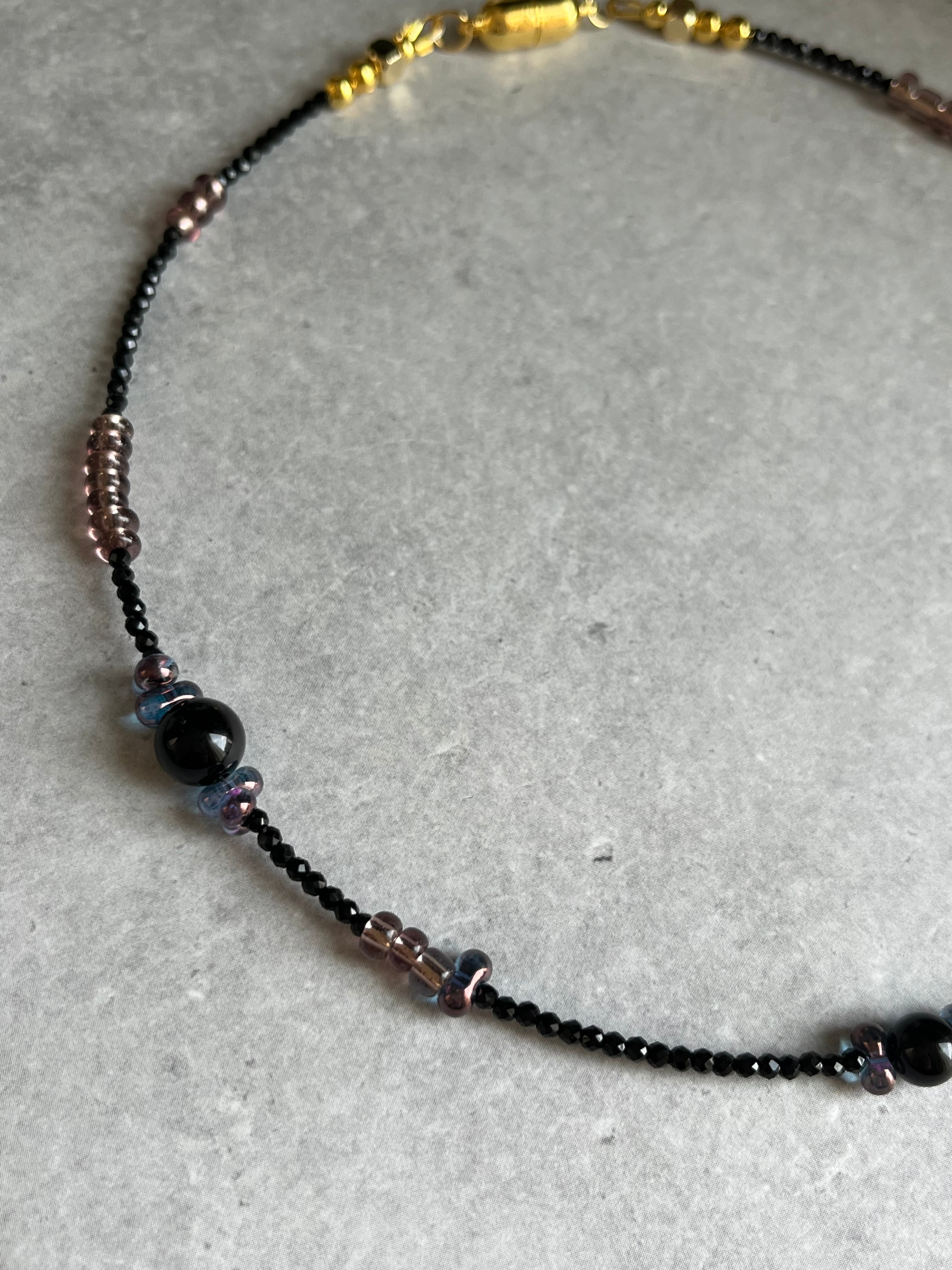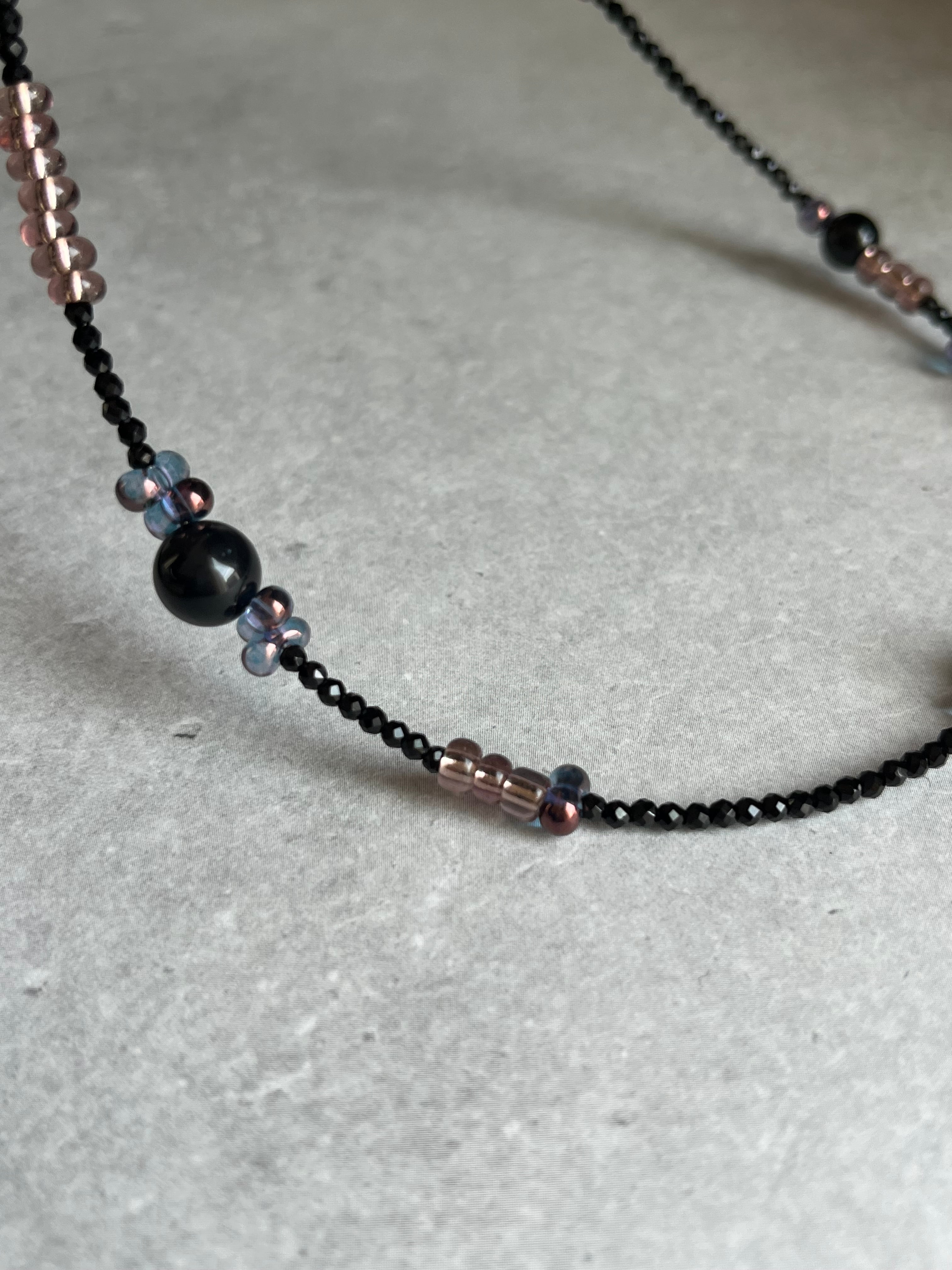 ・洗練されたリズム: 黒一色の中にも、大粒のオニキスと小粒のスピネル、そしてニュアンスカラーのビーズを配置。単調にならない、奥行きのあるデザインに仕上げました。
